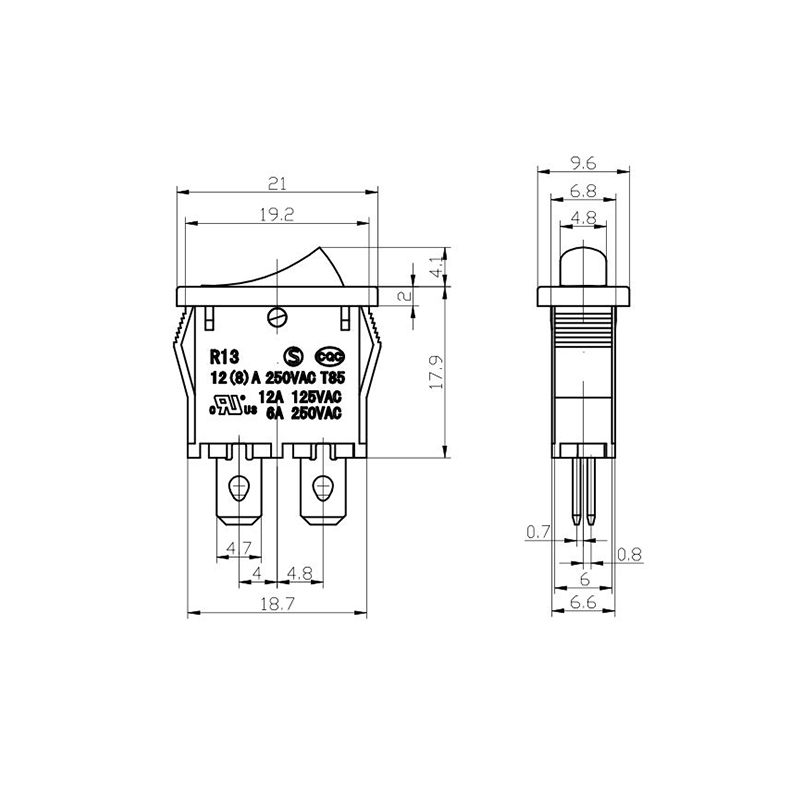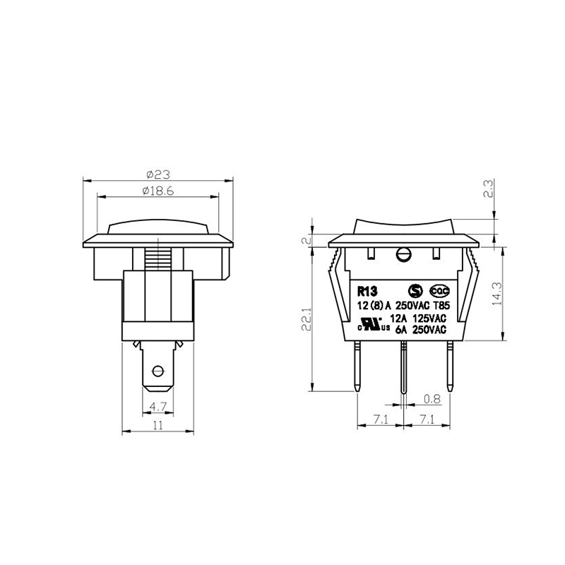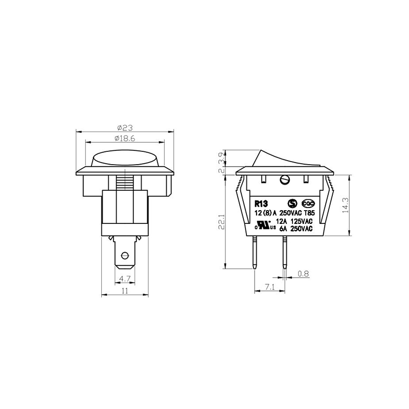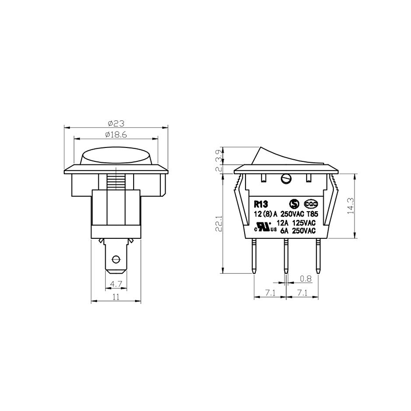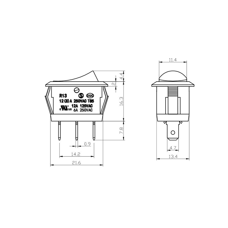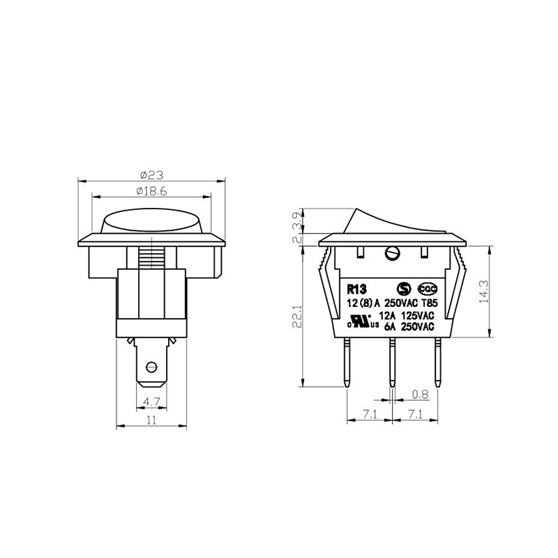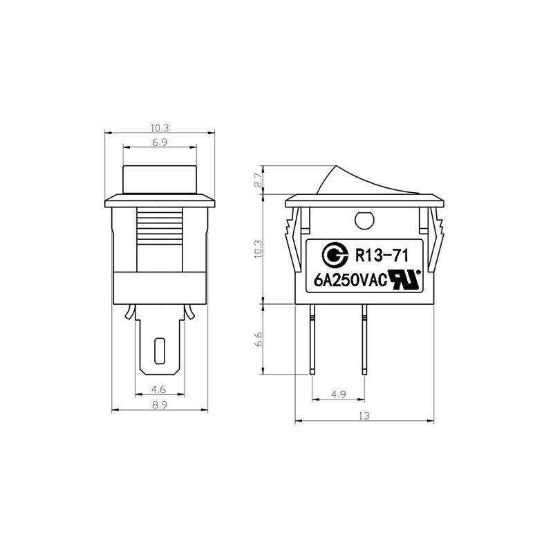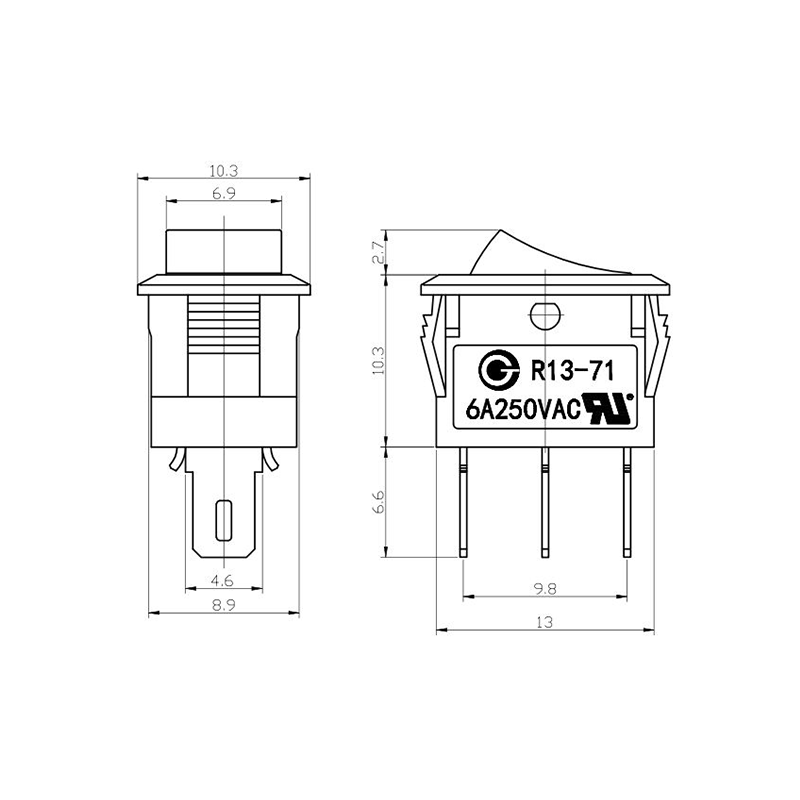 Pod względem funkcjonalności seria R13-13 oferuje układy zacisków zarówno 2-pinowych, jak i 3-pinowych, obsługujące konfiguracje obwodów SPST (Single Pole Single Throw) i SPDT (Single Pole Double Throw), aby dostosować się do różnych wymagań projektowych elektrycznych. Wyraźne oznaczenia „0/1” na siłowniku ułatwiają obsługę, a opcje kolorystyczne w czerni i bieli zapewniają wizualną spójność z ostatecznym projektem produktu.